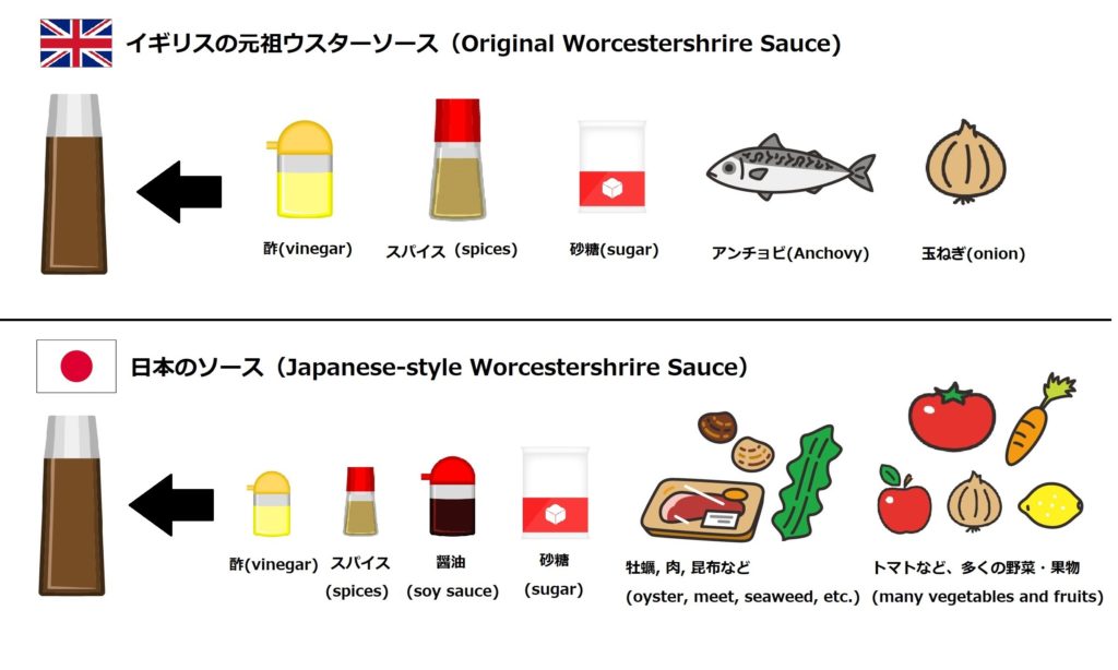 For the difference between English original worcestershrire sauce and Japanese-style one, see the illustration below. Japanese-style sauce is less sour, less spicy but richer and sweeter.